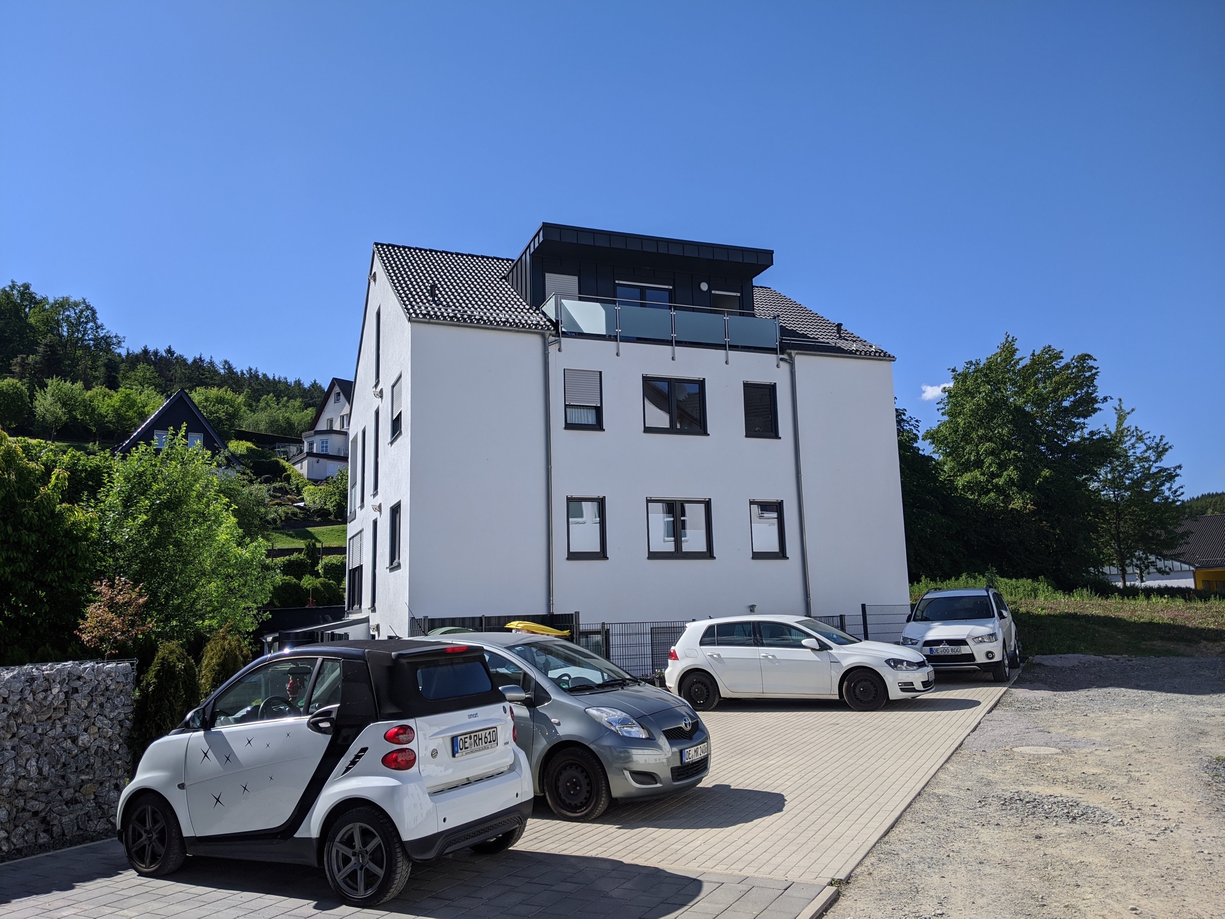Rückseite mit Stellplätzen und Loggia: